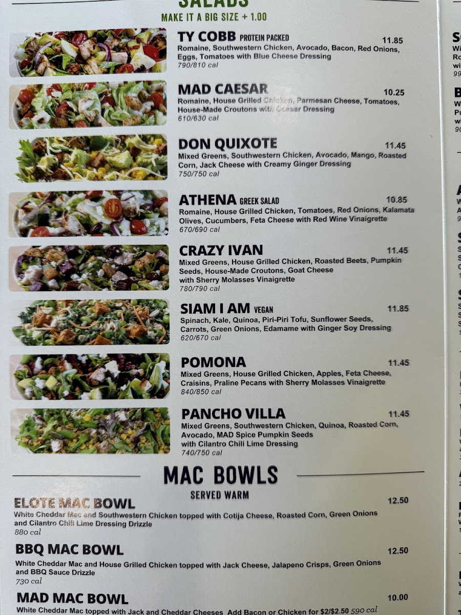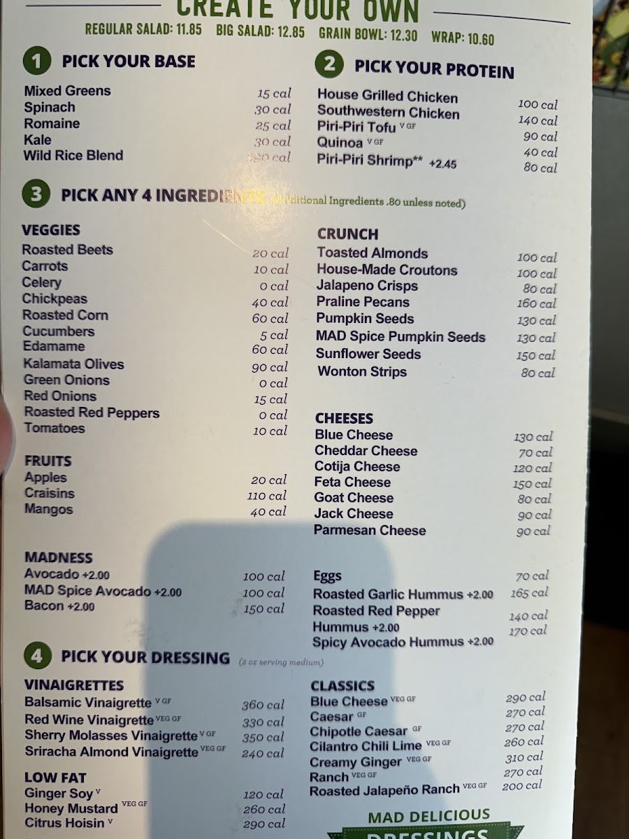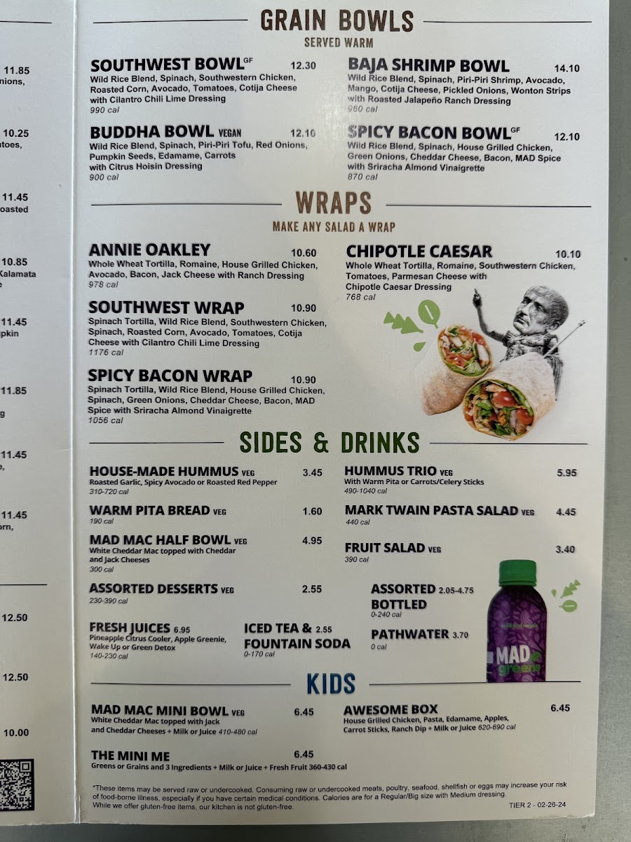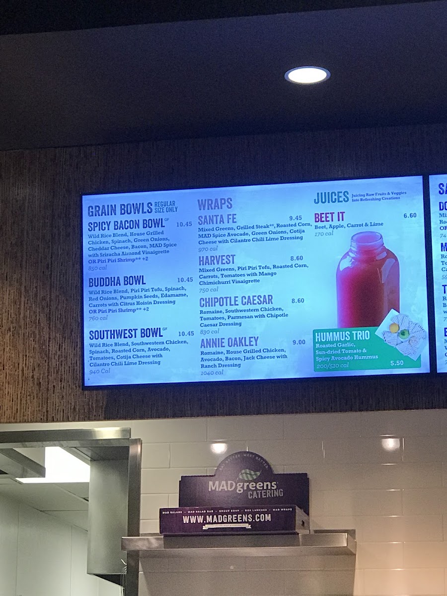 As a final takeaway on the menu at Mad Greens in Scottsdale, this location delivers a well-rounded, health-forward dining experience that feels both flexible and thoughtfully curated. From refreshing beverages like Celsius Sparkling Energy Drinks, Purified Bottled Water, Coca-Cola Bottle, Diet Pepsi Bottle, and Pepsi Bottle, to convenient Wrap Pack Group Order and One Gallon Fresh Brewed Tea Group Order options, the menu clearly caters to individuals, families, and larger groups alike. The sides add extra personality, with flavorful options such as Creamy Whipped Feta Dip, Loaded Mediterranean Hummus, Loaded Sriracha Hummus, and Stacy's® Simply Naked® Pita Chips, alongside the signature MAD Spice Bottle for fans who want to bring the flavor home. The warm bowls-including MADiterranean Bowl, MAD Mac Bowl, Wild Harvest Bowl, Southwest Bowl, and Heart & Seoul Steak Bowl-stand out as hearty yet balanced choices, while the customizable options like Create Your Own Grain Bowl, Create Your Own Wrap, and Create Your Own Salad highlight the brand’s commitment to personalization and dietary inclusivity. Salad lovers are especially well served, with bold combinations such as Pancho Villa Salad, Mangocado Salad (Don Quixote), Siam I Am Salad, Cowboy Cookout Steak Salad, and classics like Caesar Crunch Salad, Ty Cobb Salad, and Athena Greek Salad. Wrap selections-in